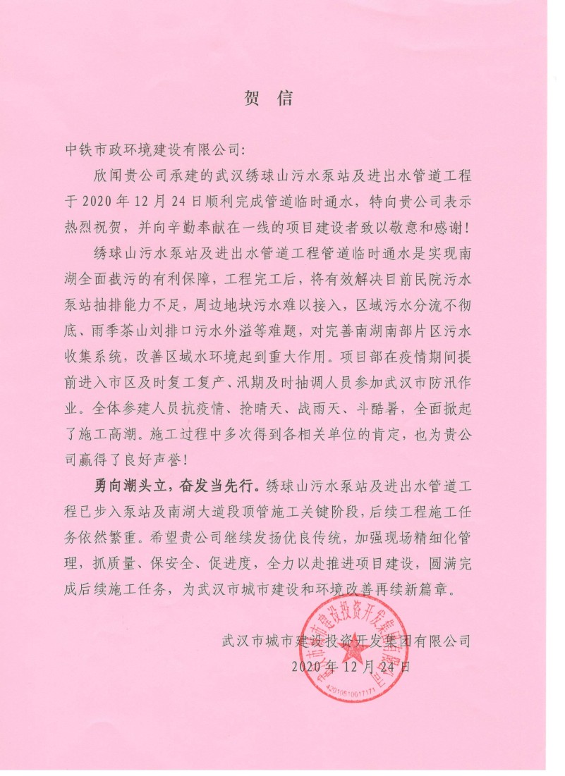 近日,湖北省總工會發布《關于對2020年全省勞動競賽先進集體和先進個人授予湖北五一勞動獎的通報》,公司武漢黃家湖污水處理廠三期擴建工程項目部榮獲“2020年湖北省勞動競賽先進班組”,斬獲“湖北省工人先鋒號”殊榮,并收到武漢三鎮實業控股股份有限公司發來的賀信。...