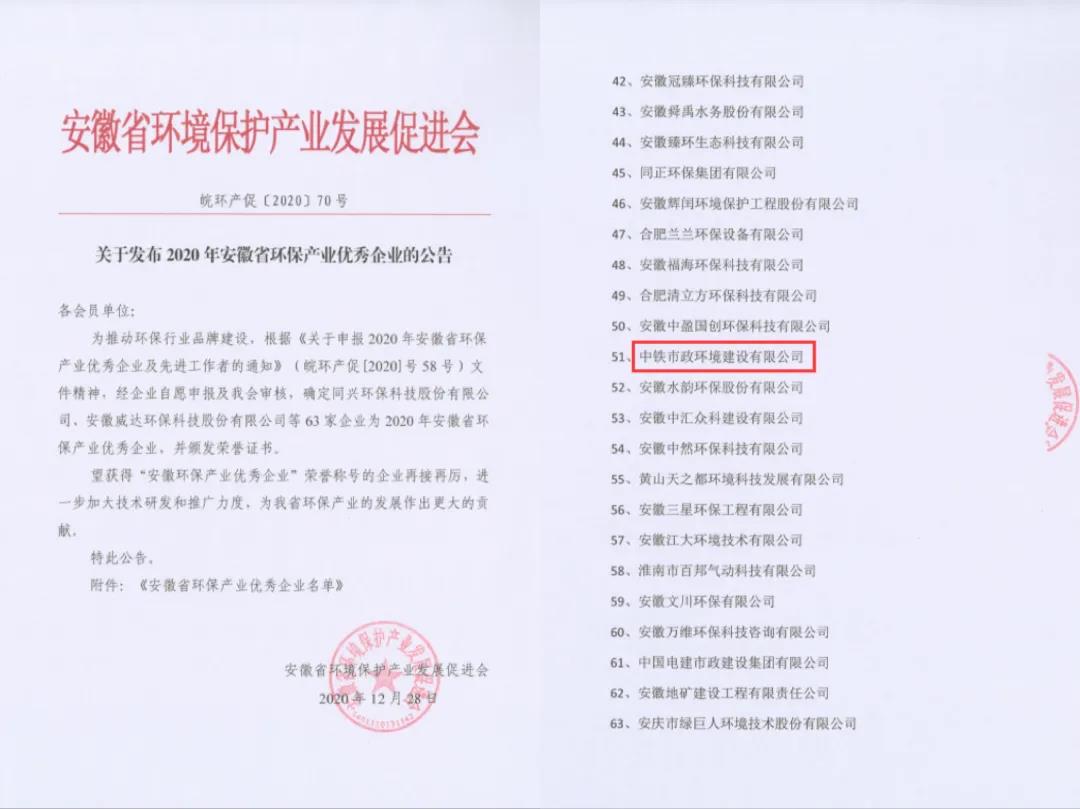 2020年12月,安徽省環境保護產業發展促進會發布“2020年安徽省環保產業優秀企業”公告、“2020年安徽省AAA級環保施工示范工地”通知及“2020年安徽省環保產業優秀企業及先進工作者”的公告。...
