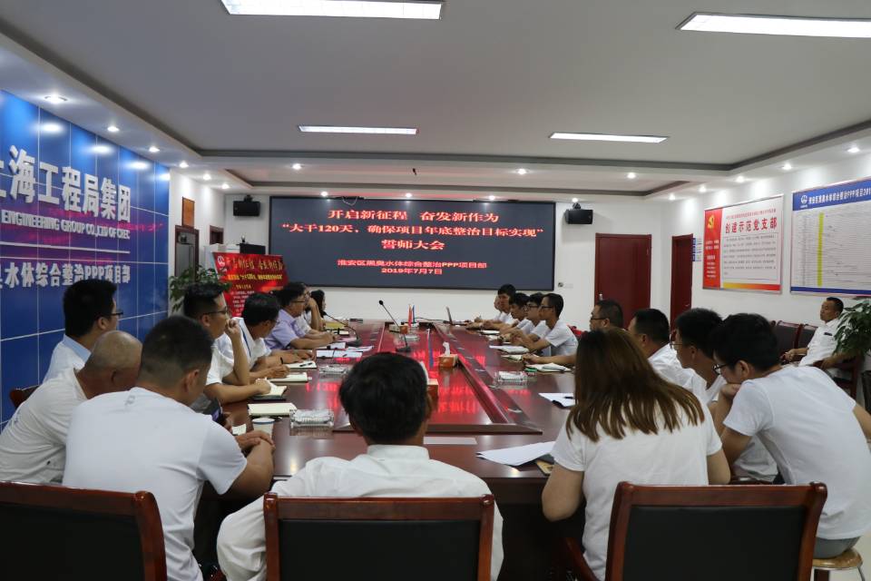 7月7日,公司承建的淮安區黑臭水體綜合整治PPP項目部召開“大干120天,確保項目年底整治目標實現”誓師大會。項目黨組織學習傳達了公司黨委“保持戰略定力,堅定發展決心,立足新的起點推動企業塑造新的輝煌”的精神, 深刻認識集團公司核心業務板塊優化組合對于推進企業高質量發展的重大意義。要求全體員工圍繞年底基本消除黑臭水體整治目標,加強工期、安全、質量、文明施工卡控,以高度企業責任感與奉獻精神,在“大干120天”競賽活動中履職盡責、創先爭優,顯示價值、展現作為,快速成長,為實現公司2019年度生產營銷既定目標貢獻心力。
